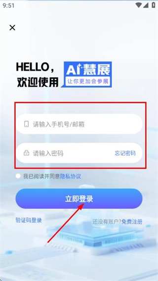 在登录页面输入手机号与密码,勾选隐私协议后,点击立即登录按钮,即可完成账号登录流程。