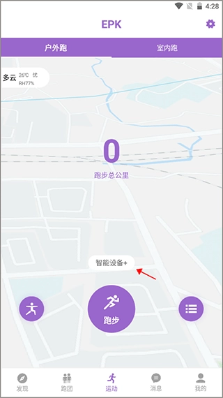 在连接前先开启蓝牙,进入软件的“运动”板块,点击上方的“智能设备+”。
