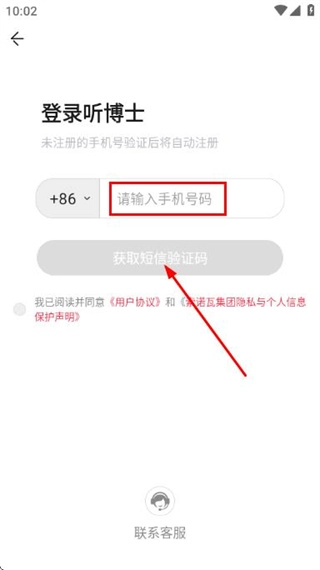 在听博士登录页面输入手机号码,勾选相关协议后,点击获取短信验证码。