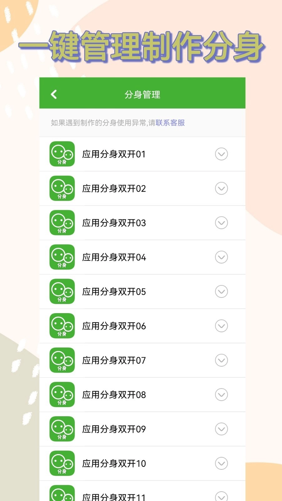 应用双开大师,一部手机,两个世界——工作、生活、游戏账号同时在线,互不干扰。多开分身支持32/64位应用分身、软件双开、产品多开,兼容安卓新系统!轻松实现应用游戏双开、多开、分身,重点适配每个分身版,一部手机轻松实现应用分身账号同时在线。独立研发的应用多开功能,实现电商等应用多个小号同时在线,不限多开个数,解决多个账号频繁切换登录的烦扰,多个,同时在线,无延迟同时收发消息。