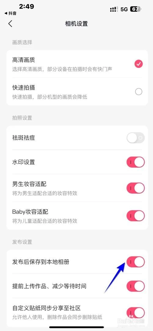 在相机设置页面,找到【发布后保存到本地相册】这个选项,然后点击它右边的开关,把【发布后保存到本地相册】功能打开就可以了。