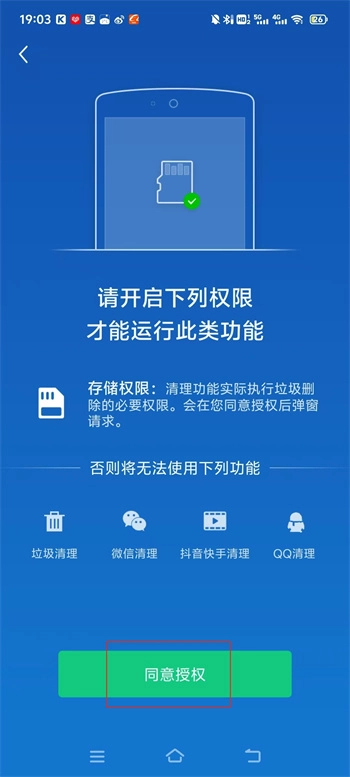 接下来系统会提示你同意软件的权限管理,这样才能更彻底地对手机进行清理操作,请点击下方的【同意授权】按钮来完成授权。