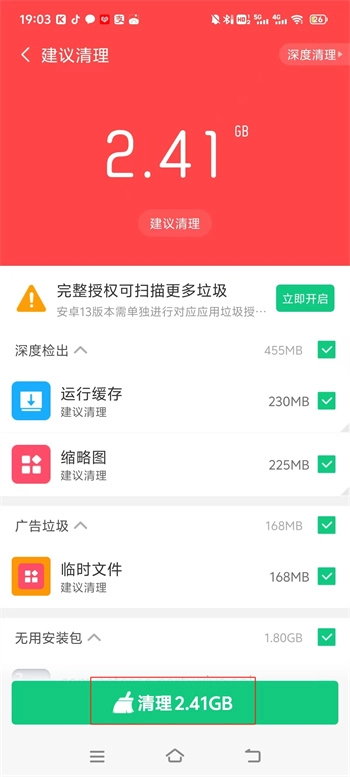 第一步先点击屏幕中间的【立即清除】,就能开启手机垃圾清理任务。