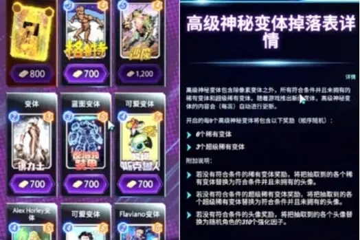 稀有变体与超级稀有变体可通过商店每日刷新购买。其中商店还售有定价800金块的高级神秘变体,千万别买!!!再次重申,该游戏没有随机,所有看似随机其实都是固定的!高级神秘变体9个为一组,每组中有且只有6个稀有变体及3个超级稀有变体,因此不要想着当赌狗,你永远不可能连续开出好几张超级稀有变体。而终极变体在代币商店8小时轮换一次。终极变体目前并无特效(特效还在设计师画的饼里),除非特别喜欢不建议购买,因为5000代币真的太贵了。值得一提的是,如你通过礼包等途径获取了还未拥有卡牌的变体时,你是可以使用该卡牌的,但在后续开箱过程中依然会开出其本体。