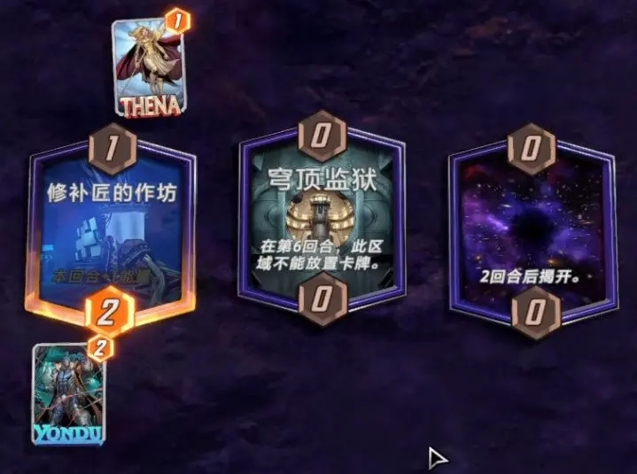 玩家通过在3个地形放置卡牌来争夺地形的胜利,需要注意的是,每个地形最多只能放置4张卡牌。
