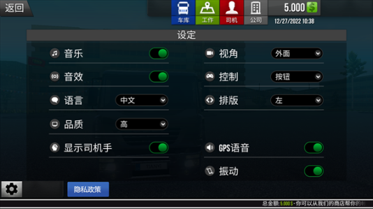 1、模拟卡车真实驾驶中文版游戏中有各种摄像机角度(内凸轮,前凸轮,外凸轮等)。