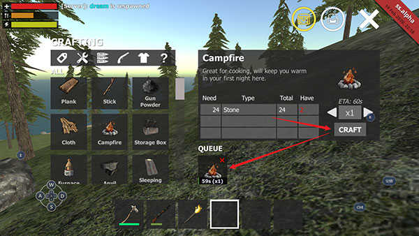 5、那么请拿起你的小斧头去石头上砍几下获取足够的石头,不过由于小编带来的是,所以玩家们只需要进游戏商店内购买Stone(石头)即可,不过也可以直接购买Campfire。