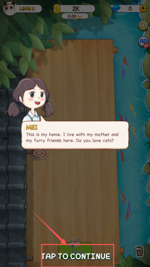 在「Level 0」界面点击「TAP TO CONTINUE」可以跳过剧情,从而知晓这里是猫咪的家。
