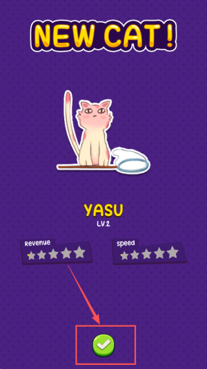 当界面出现「NEW CAT! YASU LV.2」提示时即刻解锁,五星状态下可提升速度并增加收益,通过循环升级并观看广告还能实现收益翻倍。