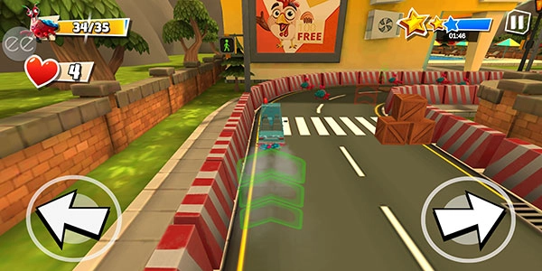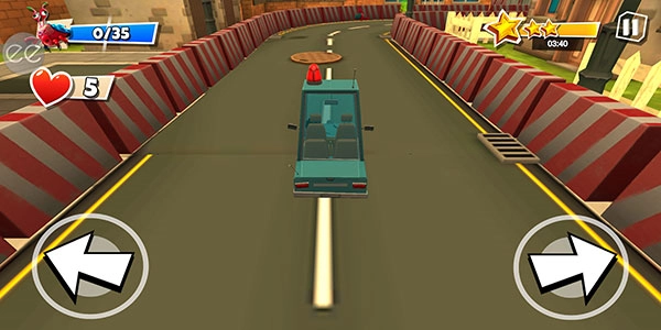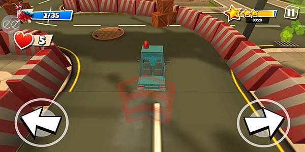 驾驶途中,赛道上会出现堆放的盒子,咱们得尽量绕开它们,不然就会减少生命值——也就是左边爱心的数量。