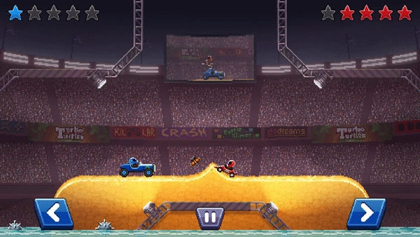 游戏在屏幕下方两侧设置了固定的左右移动按键,操作上除了左右移动外没有其他复杂的指令。尽管控制方式简单,但实际游玩时并不轻松:因为车辆重量较轻,快速左右移动时很容易出现重心偏移的情况。玩家可以利用这一点翘起前轮,以此创造进攻优势,但同时也要避免因过度倾斜而导致翻车。如何精准地控制车身平衡,是对玩家操作技术最直观的考验。