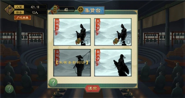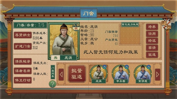 游士:当国家的人望提升至特定级别后,天下的人才便会主动汇聚到驿馆之中。届时,你既能够招募这些人才为己所用,也可以选择将他们软禁起来,或是关押到禁府里。