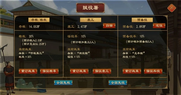 在游戏里,国家处理各项事务时,粮草是主要的消耗资源,因此国库中的粮草储备就显得尤为关键,而粮草的主要获取途径正是国家税收。游戏开局后的十几年乃至几十年里,如果没有合理设置税率,很可能会造成国库长时间处于亏空状态。这里建议大家在开局时把粮草税率调整到30%,等国库有了充足的粮草储备,并且每年的粮草存量都能稳步增长时,再考虑下调税率。