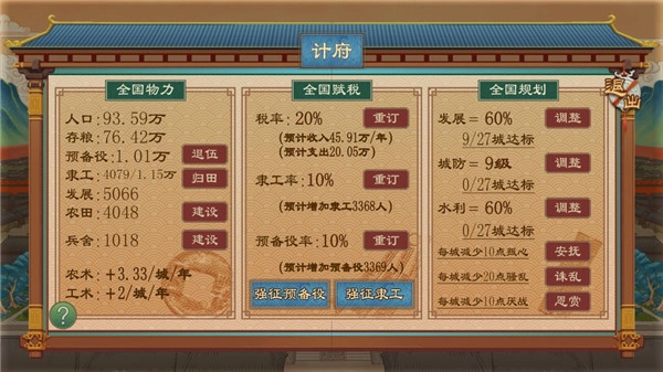 全国发展规划关系到后续每年的财政收支情况,你可以在“游戏界面右侧切换都城视图-计府”里找到【百工署】来调整发展规划。通常开局时建议把发展比例设为30%,城防和水利等级定为3级,这样更有助于国家在前期实现平稳发展。