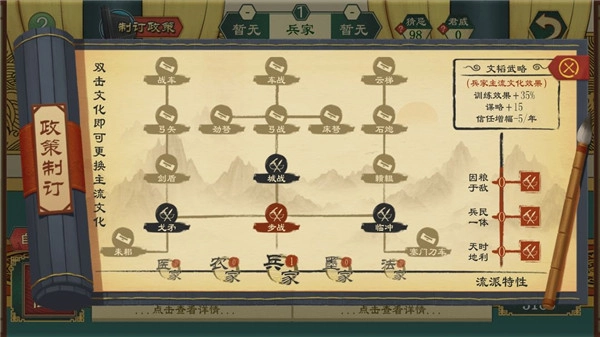 游戏内设有九种流派,这些流派是国家发展的基础导向,不同流派会影响国家的发展走向以及各项能力的高低,新手初次游玩时建议选择【农家】或【兵家】。