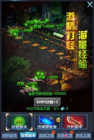经验副本的核心是让玩家获取大量经验。玩家只要击杀足够数量的怪物就能完成任务。该副本每日可挑战一次,且挑战次数会随着SVIP等级的提升而增加。完成挑战后,玩家可以选择一倍、二倍或三倍的经验奖励。