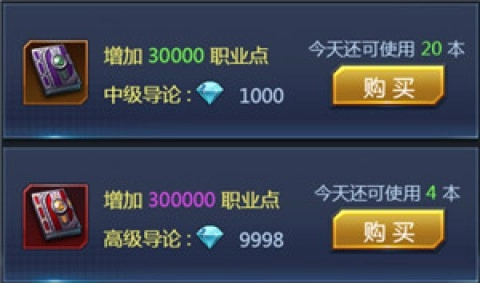 首先强烈推荐使用钻石购买中级和高级导论,这两种道具可以为你提供大量的职业点。角色每次转生都会大幅提升战斗力,尤其在游戏的前中期,购买导论会是你快速增强实力的最优选择。其中高级导论的价格是9998钻,中级导论则仅需1000钻。