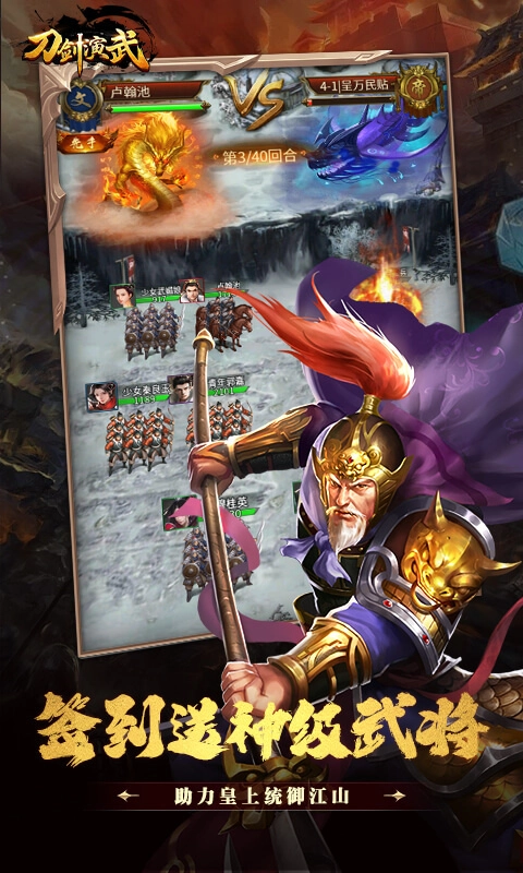 《刀剑演武》是一款热血策略卡牌游戏,游戏采用了极为精美的美术设计,在剧情叙事与战斗动画方面也进行了深度优化。玩家将在此开启一段传奇征程,通过完成天命传承的使命,一步步登临帝位。在游戏中,你将执掌至高皇权,惩治不忠叛逆之徒,开创全新的太平盛世;还能结识上百位历史名将,巧妙搭配武将间的羁绊与技能,打造属于自己的强力阵容。