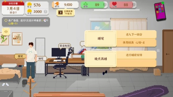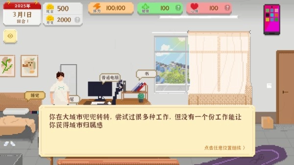 这是一款模拟经营游戏,玩家将化身在南方小县城独自打拼的年轻人。当遭遇失业的挫折时,你需要白手起家,用心经营自己的生活,一步步实现个人价值,最终活出属于自己的精彩人生。游戏巧妙地融合了现实的骨感与梦想的丰满,带领你真切体会独自生活中的各种滋味。