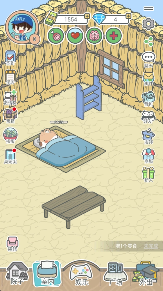 进入游戏后就能看到自己的宠物,上方的四个圈圈依次对应饥饿、心情、睡眠和健康状态。