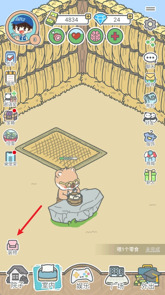 回到家后,先点击宠物,接着点击第一个刀叉形状的按钮,就能给宠物喂食了。