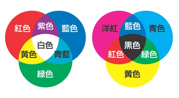 左侧为色光的三原色,右侧为美术的三原色。