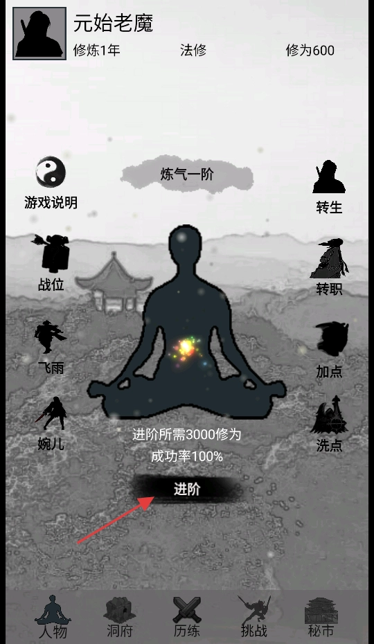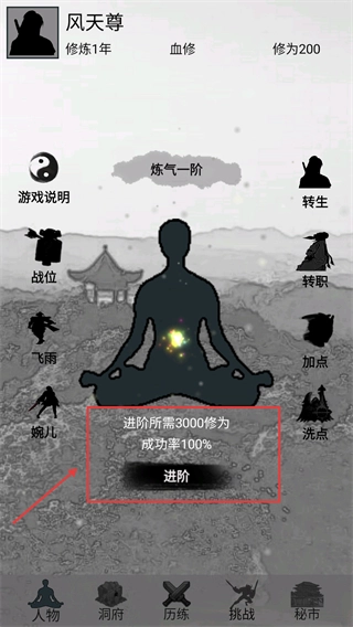 角色达到炼气一阶后,积累3000修为就可以点击进阶按钮,进阶成功率为100%。提升境界能够增强角色的战力,从而帮助角色更好地进行后续的修炼和挑战。