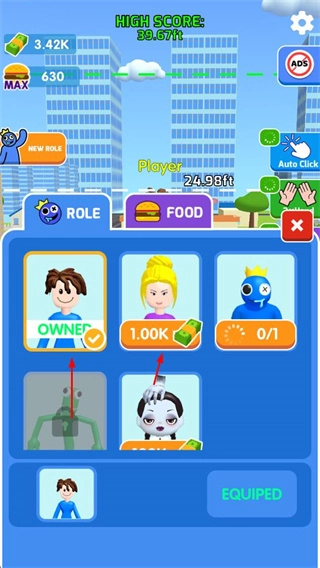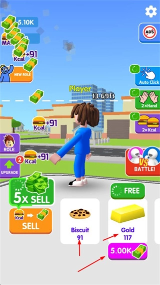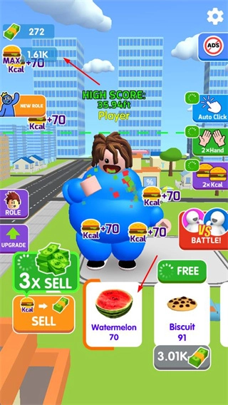 点击SELL按钮,或者借助倍数售卖功能,把卡路里兑换成现金,积累起来的资金可以用于解锁食物、升级角色之类的操作。