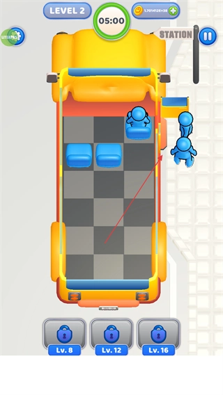 进入第二关,注意屏幕上方的五分钟倒计时,操控小人上车并坐好。