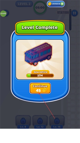 关卡完成后,可查看对应的奖励内容,例如新车辆的解锁进度显示为2/14;之后点击Continue按钮,消耗相应资源即可进入下一关。