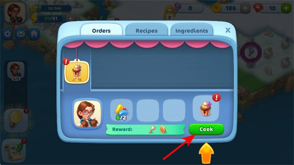 在订单界面点击Cook按钮,就能制作纸杯蛋糕这类食品,这是获取资源与经验的重要操作,有助于提升角色等级。