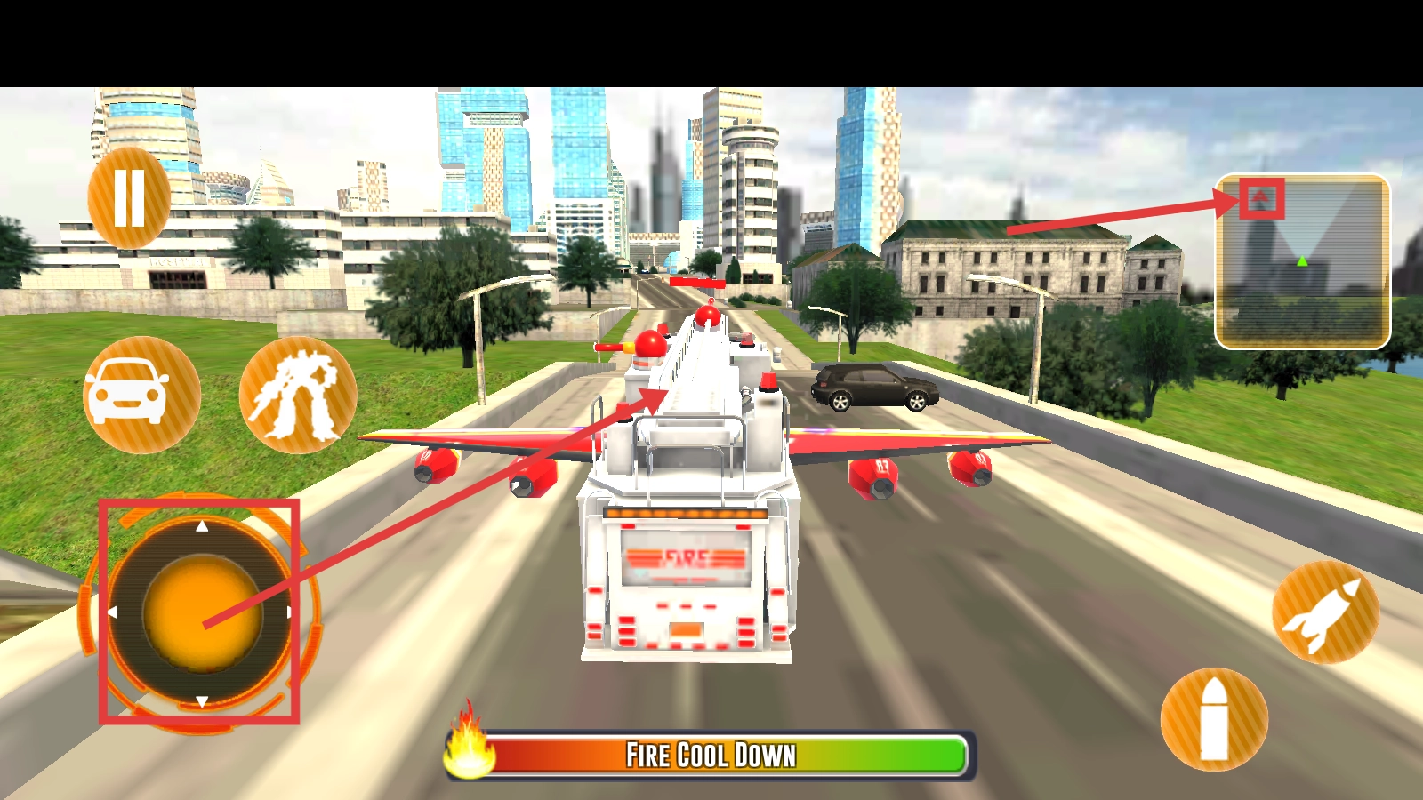 通过左侧轮盘操控消防车辆移动,根据右侧地图导航前往火灾现场,行进过程中可借助技能按钮来辅助行动。
