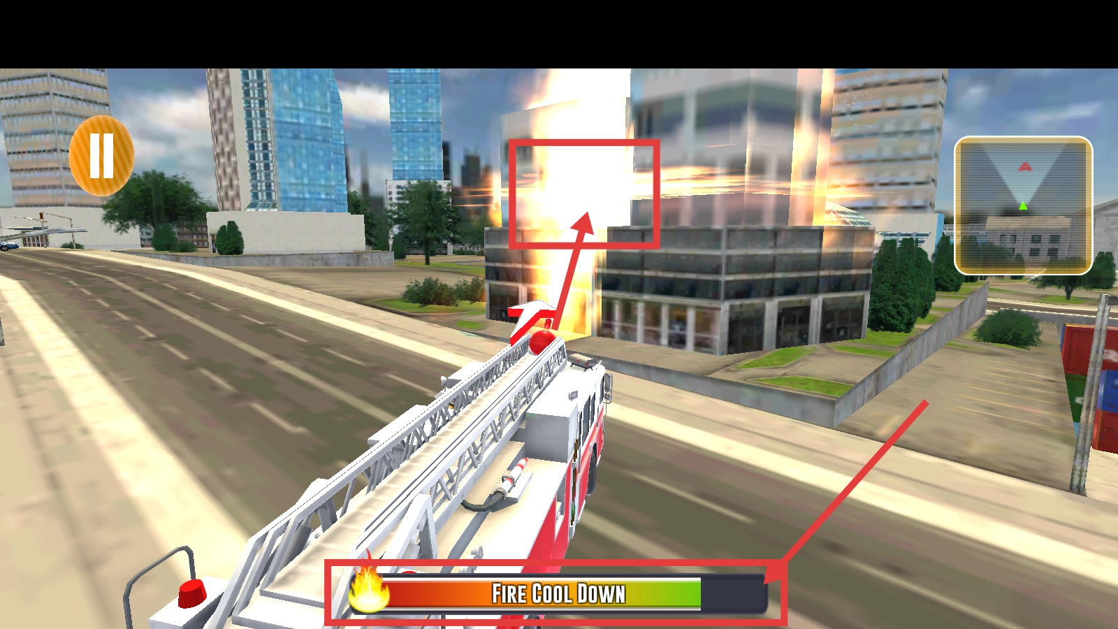 到达起火建筑后,留意【Fire-Cool-Down】进度条,适时进行灭火作业,遏制火势扩散。