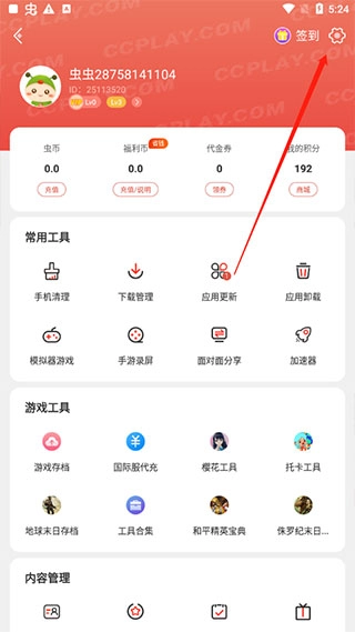 首先启动虫虫助手应用,进入主页后,点击界面左上角的头像图标。