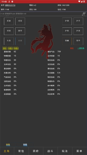 在主角界面,你能够查看角色的基本属性,还可以为角色穿戴已经获得的装备。