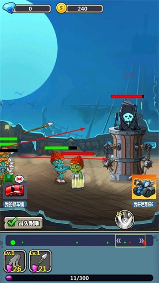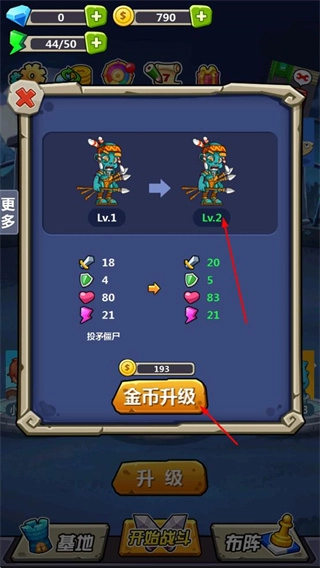 成功闯过关卡就能得到金币,这些金币可以用来解锁新的丧尸种类,还能给已有的兵种进行升级。兵种升级之后,它们的属性和战斗力都会有明显的增强。游戏的养成系统和战斗推进的进度是相互关联的,这样就能鼓励玩家不断去闯关,以此来获取更多的资源。