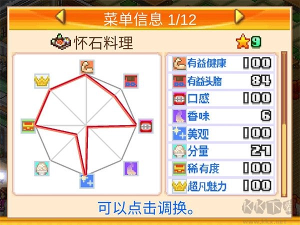 每一种料理都具备有益健康、有益头脑、口感、香味、美观、分量、稀有度、超凡魅力这八项数值,下文将这八项数值统一称为“八维”。进入料理开发环节后,我们能在菜品的八维图中直观地感受到这些数值的具体表现。