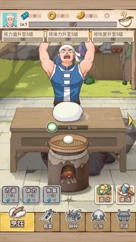 经营面点摊位时,通过增强体力、力道这类属性,持续捶打面团,从而实现快速出品。