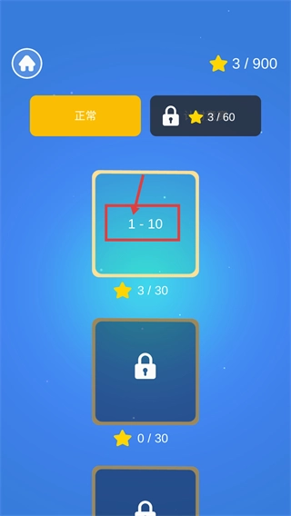 进入关卡选择界面后,建议优先挑战已解锁的【1-10】关卡,通过积累【星星-3/30】来解锁后续内容。