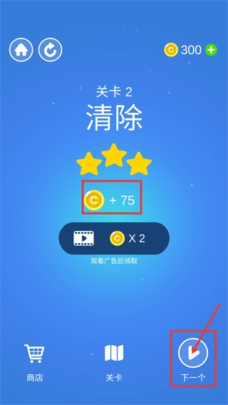 关卡结算后会获得【金币 +75】,点击【下一个】按钮可进入后续关卡,也可以通过观看广告来使奖励翻倍。