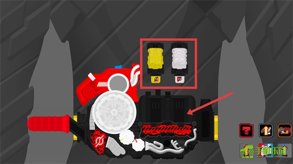 选中红框内的黄白相间道具,把它安装到腰带装置上,以此进一步完善变身组件的配置。