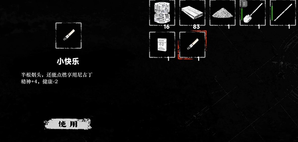 烟头:可通过翻找垃圾或击败敌人获取,使用后能增加精神点,不过会降低健康值。