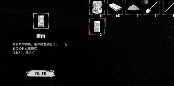 腐肉:探索翻垃圾获得,放到捕兽夹获得生肉。