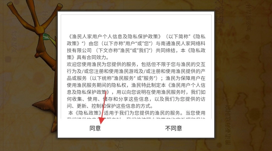 首次启动游戏,仔细阅读《渔民人家用户个人信息及隐私保护政策》,确认无误后点击【同意】按钮,即可进入游戏登录界面。