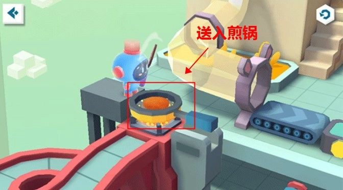 “咚”——生肉块登场,宝贝开始忙活啦:先把压肉机按下去,给生肉块换个“新模样”。看,煎锅旁的机器人已经等了好一会儿,宝贝快拿起锅铲弹弓,对准煎锅,把生肉块发射出去!听,肉块在锅里发出滋滋的声响,等它熟透就能去下一个地方了。