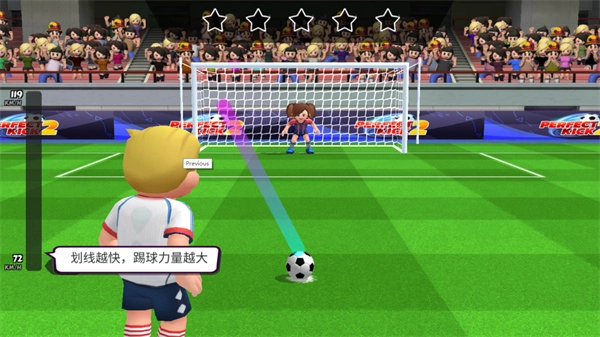 用手指朝球门滑动,球就会朝着滑动的方向被踢出;滑动的速度越快,球飞出的速度也就越快,左侧的速度表会实时显示球的速度。