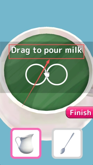 接下来,按住容器并拖动,把牛奶精准地倒入指定位置,要留意把控流速以防溢出。