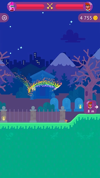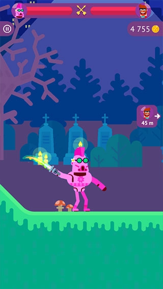 游戏的画面呈现尚可,操作层面沿用了经典的弹射机制,和《愤怒的小鸟》有几分相似——玩家只需在屏幕上按住主角周边区域,向后拖动手指,就能看到反弹能量值与角度值的显示,松开手指的瞬间,手中的武器便会径直发射出去。