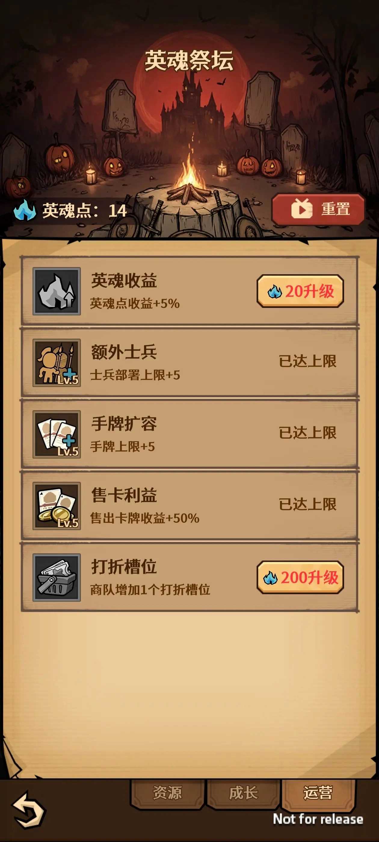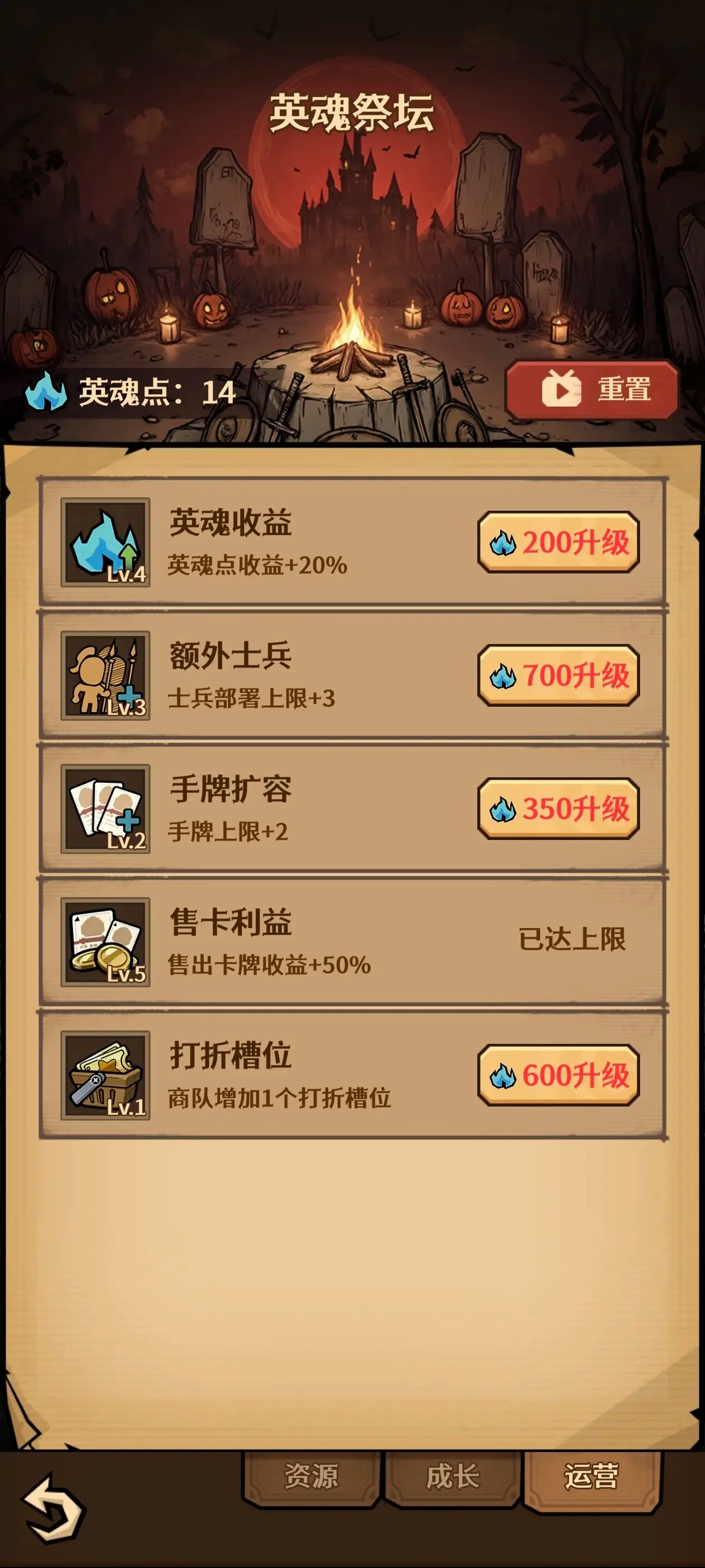 在你基本成型后,当仅依赖火龙的百分比伤害时,再次退出并重置点数,第三页还是先点满出售卡牌的收益,接着点满额外士兵和手牌扩容。