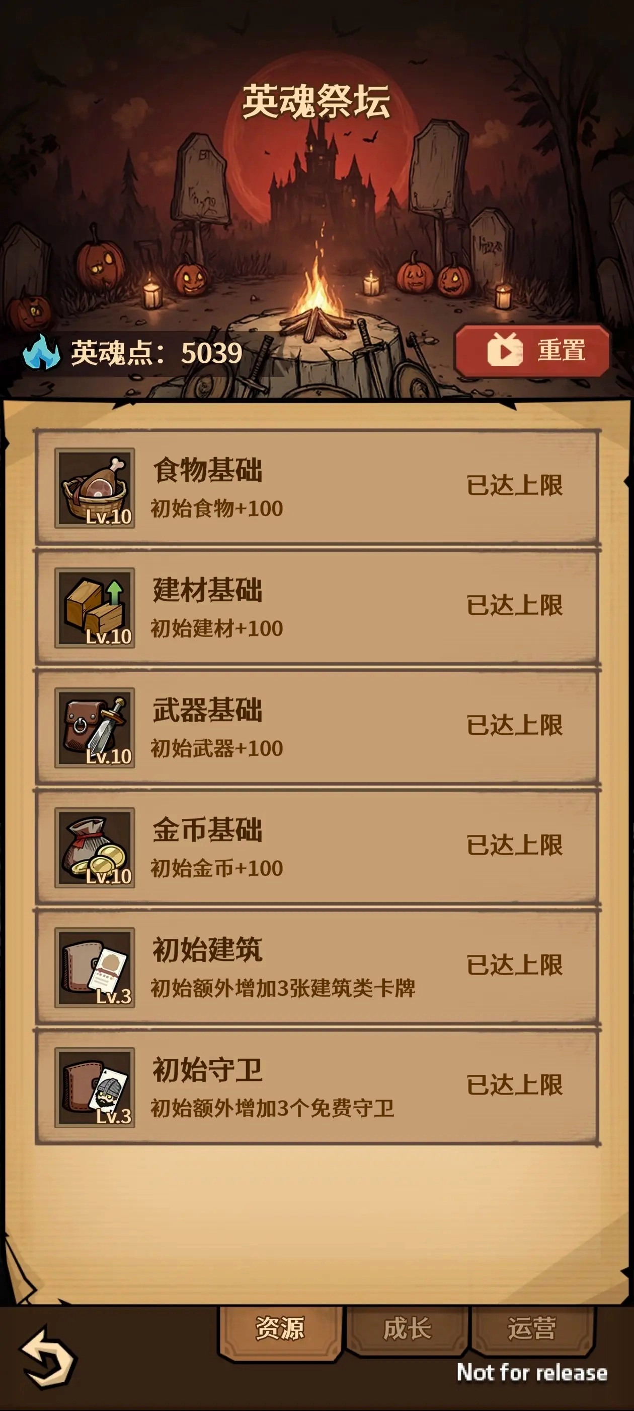 完成第一回合后保存退出,接着重置英魂点数。先把必需品、出手卡牌的额外收益点满,再点第二页的食物提产和建筑提产,剩余点数全部加在攻击提升和生命提升上。